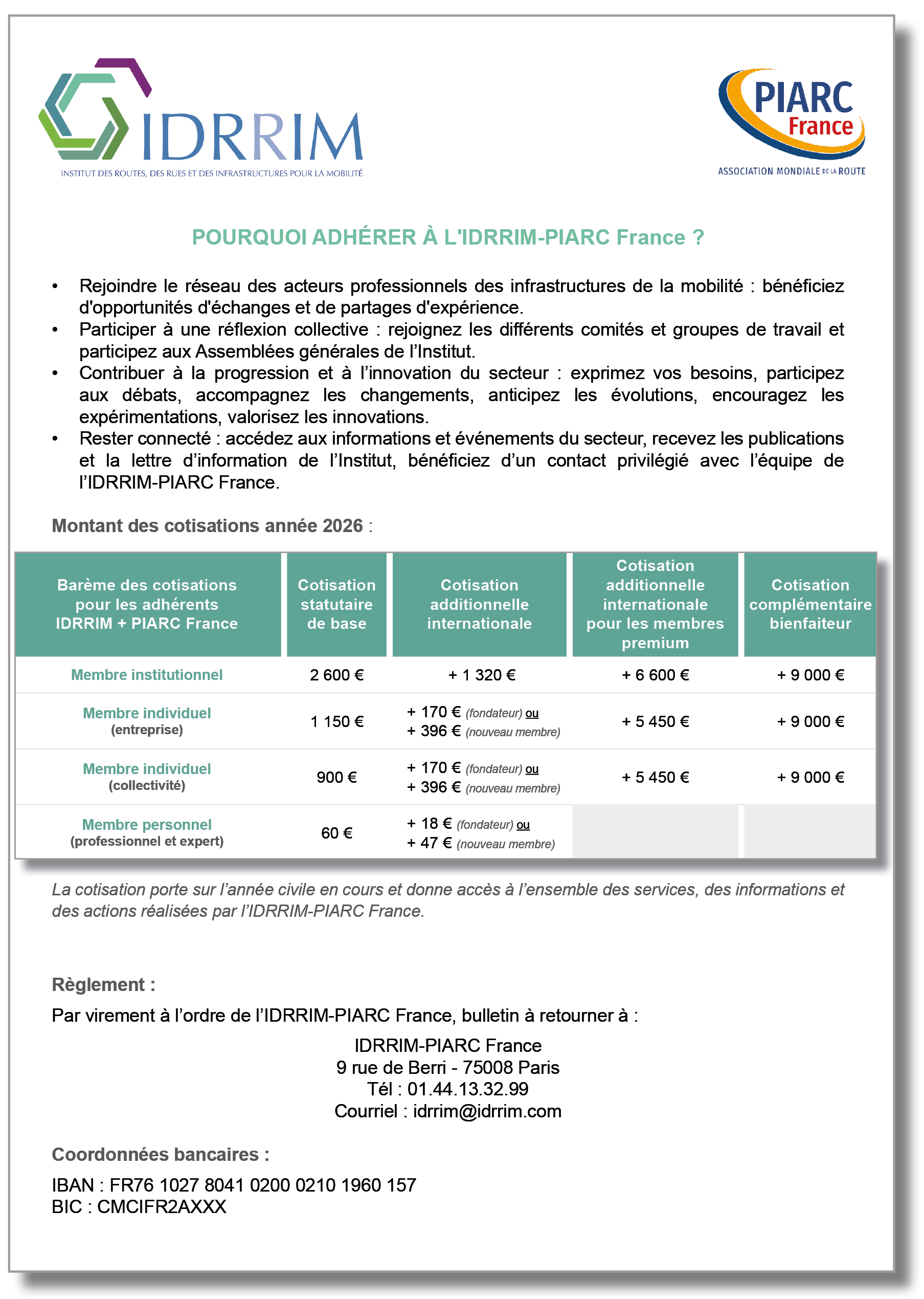 La demande d’adhésion est soumise à approbation du Conseil d’administration et de l’Assemblée générale de l’IDRRIM-PIARC France.